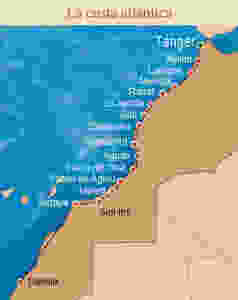 La costa Atlántico marroquí es mucho más diversa y poblada que la mediterránea. Va desde Tánger hasta Dakhla, en el extremo sur del Sáhara Occidental y en ella nos encontramos con ciudades tan importantes y cosmopolitas como Rabat o Casablanca, más tranquilas como Agadir o Essaouira y pequeños pueblos llenos de encanto como Asilah o Diabat.En cuanto a las playas las hay de todos los tipos y para todos los gustos y los amantes de los deportes acuáticos encontrarán aquí un auténtico paraíso.ya que es ideal para practicar el Surf, windsurf o kitesurf por estar situada a mar abierto y en zonas donde las corrientes marinas y los vientos de la montaña y el desierto crean grandes olas. Al norte encontraremos playas más bulliciosas y a medida que nos desplacemos al sur, iremos encontrando extensas playas desiertas.